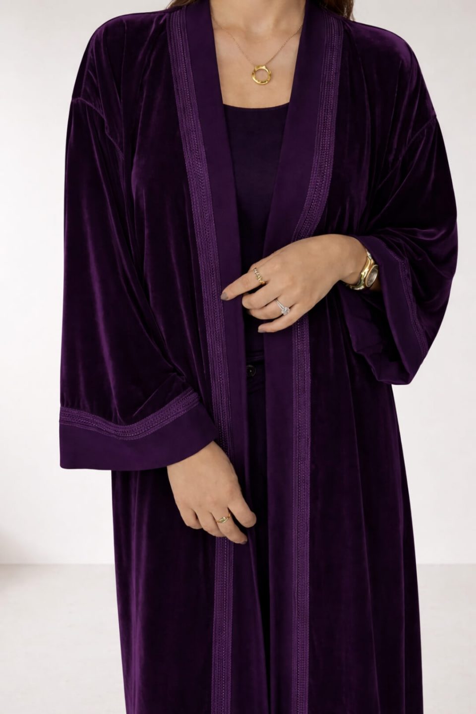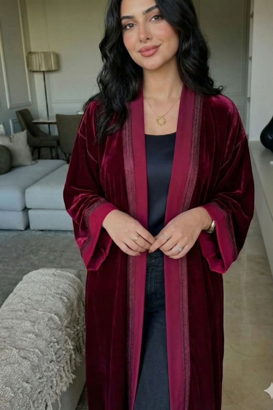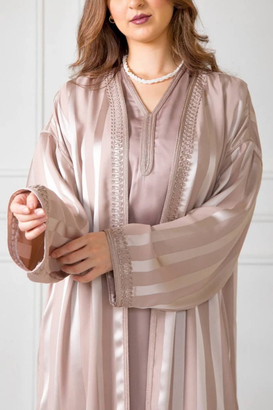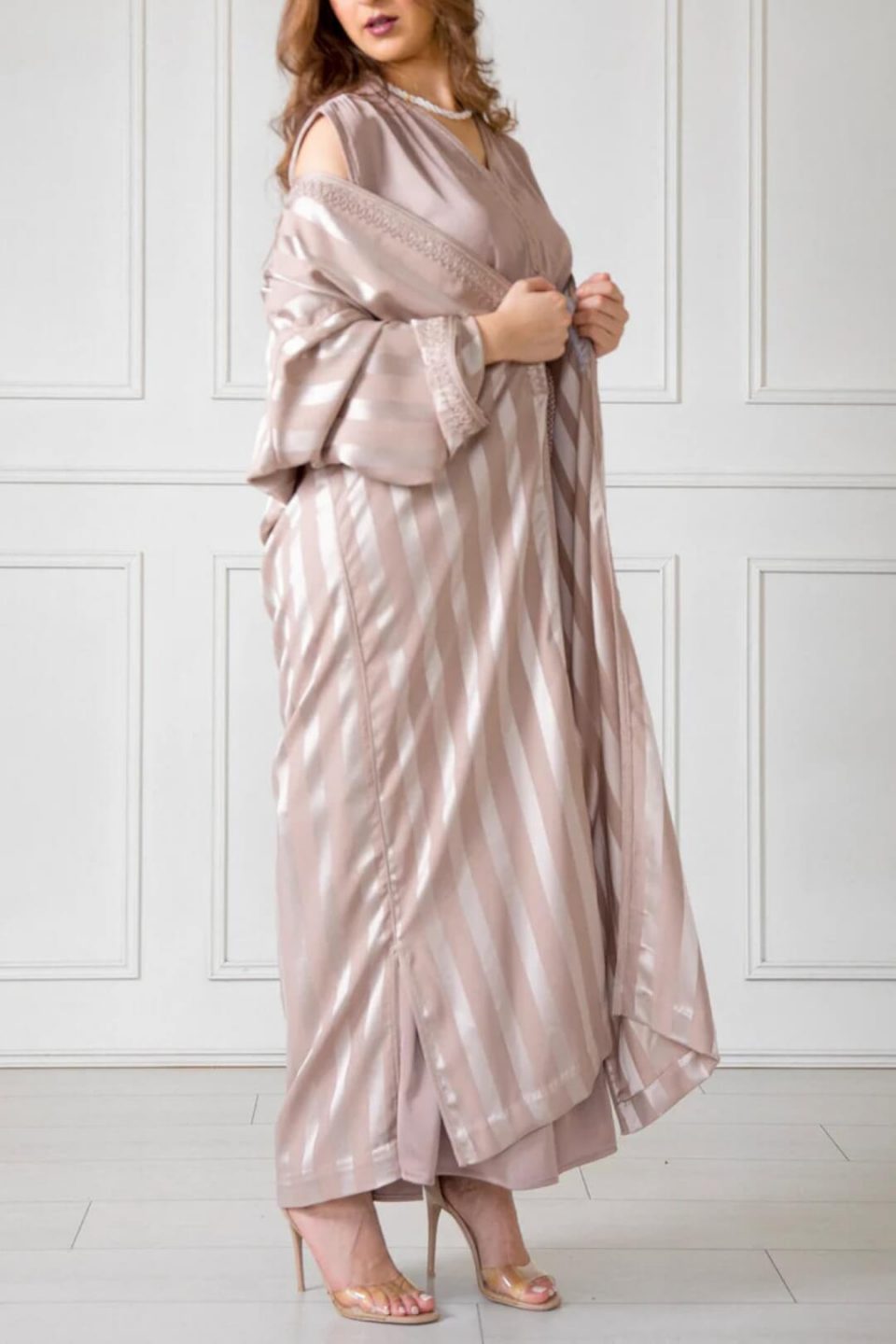 Serenity Aura Kimono evokes calm and sophistication with its flowing beige satin silhouette. Designed with minimalist Moroccan refinement, it drapes effortlessly, offering a serene balance of comfort, elegance, and timeless allure.